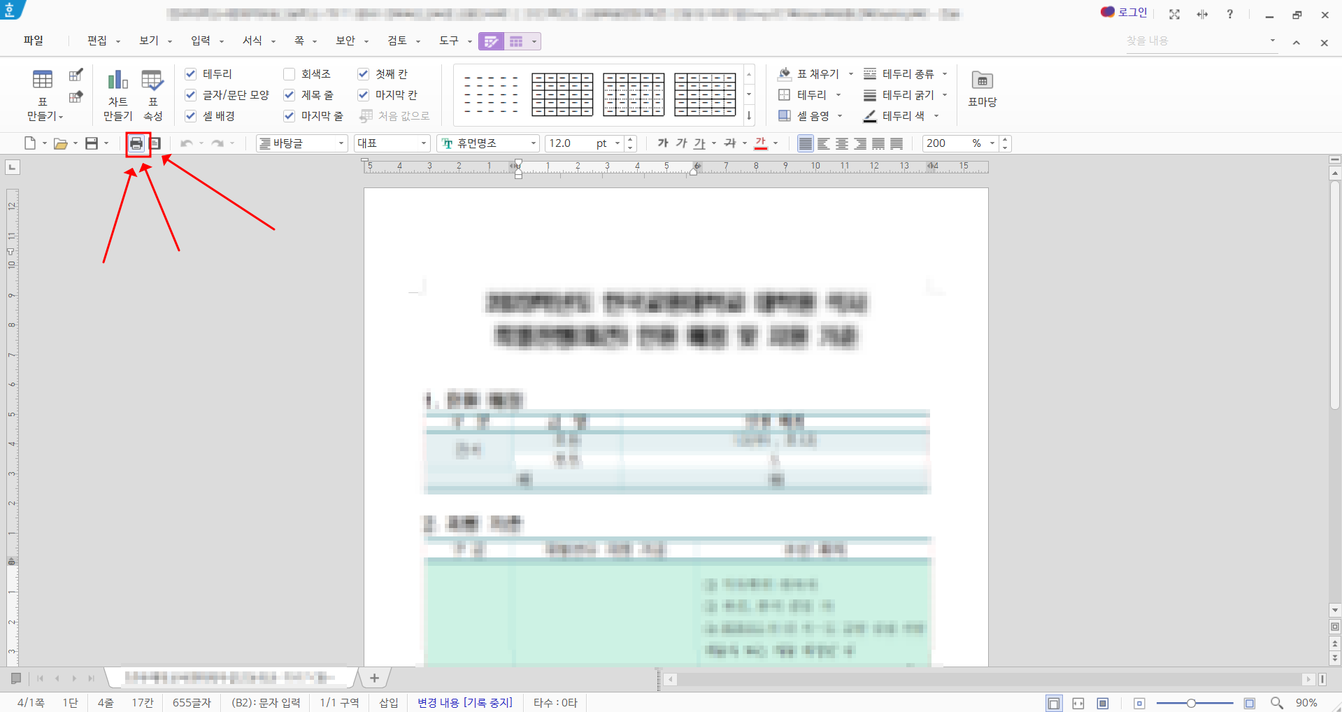 편집을 마친 상태에서 프린터 모양을 찾아 인쇄 명령을 실행합니다.
